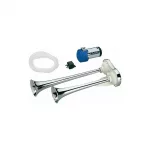 Bocina con compresor dos trompetas. Construida enteramente con material anticorrosivo. Trompeta en laton cromado de alta resistencia, base de fibra de vidrio y nylon con tapa de acero inoxidable. Completa con kit de montaje y rele. Potencia 105db a 2 metros. Peso 1,4 Kg. 12v, 18 Amp, 326/412 Hz, longitud 390 mm.